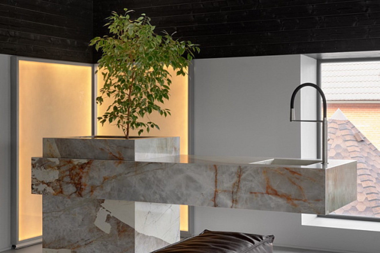Эффект цельного камня достигнут благодаря уникальной технологии фотокроя, которая позволила безупречно соединить отдельные плиты в монолитный объем с идеальными стыками. Материал – кварцевый агломерат, безупречно имитирующий узор натурального кварцита Патагония. Несмотря на визуальную легкость, консольная часть невероятно прочна и рассчитана на серьезные нагрузки. Устойчивость и надежность массивной формы обеспечивается за счет скрытого внутреннего каркаса из металла.